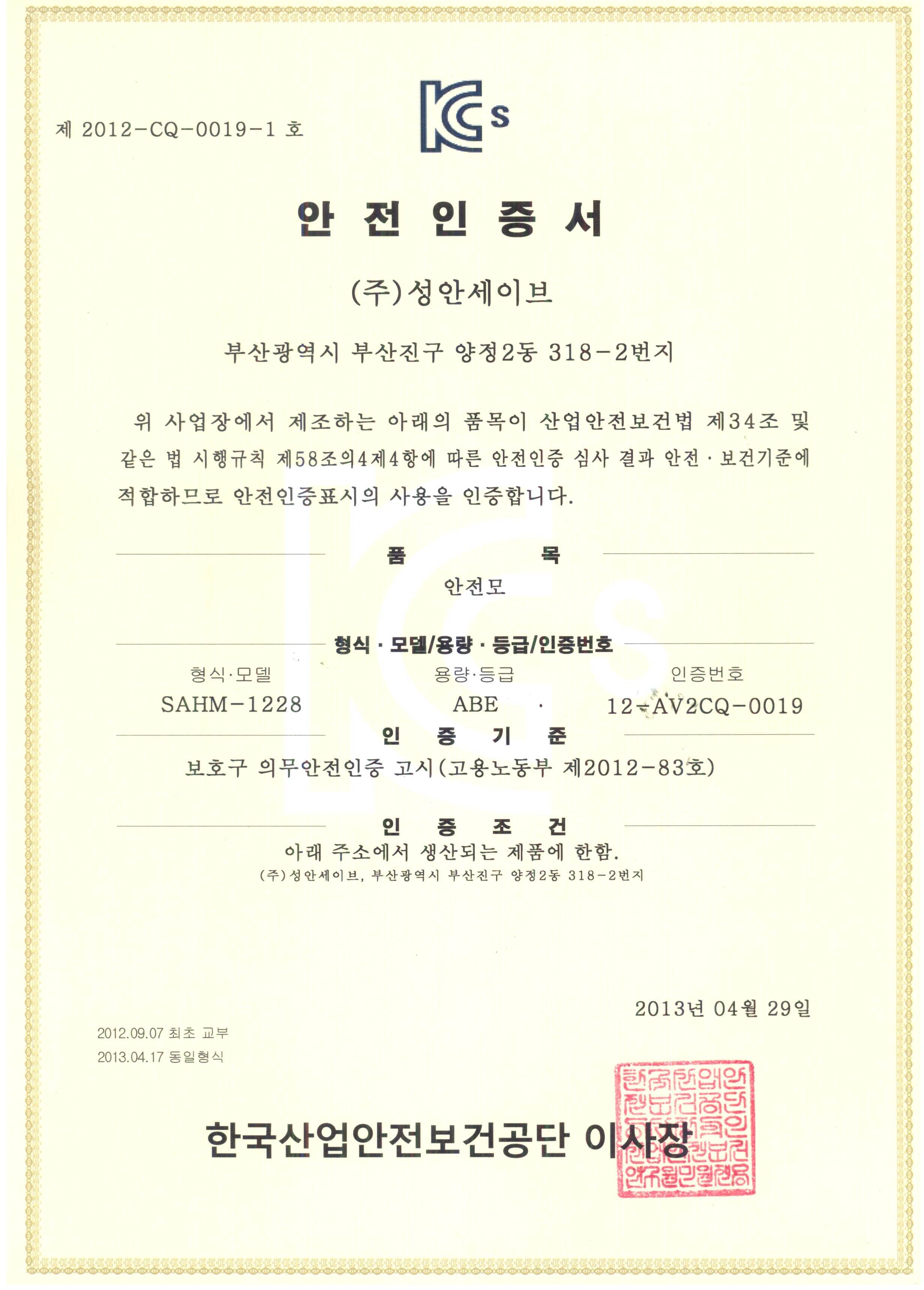 안전모 인증서