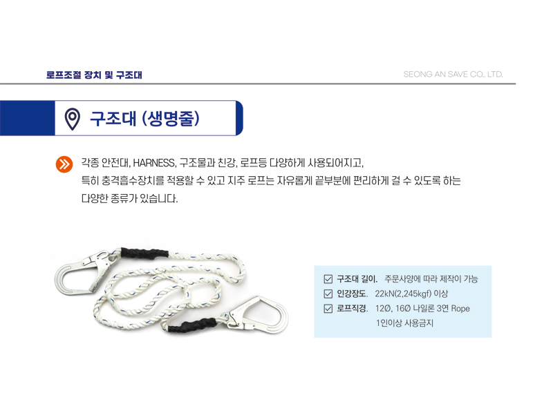 고생많으십니다. 저는 조선소에서 안전관리를 하고 있는데요. 현장에 보니 성안세이브에서 제작된 구조대(생명줄)이 있는거 같아 홈페이지 카다로그보니 해당제품이 없는데 혹시 이게 성안세이브에서 제작된 생명줄이 맞을까요?